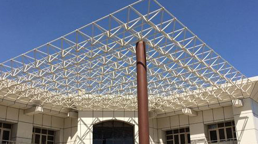 A Space Frame is a truss like, lightweight rigid structure constructed from interlocking struts in a geometric pattern. Space frames usually utilize a multidirectional span, and are often used to accomplish long spans with few supports. They derive their strength from the inherent rigidity of the triangular frame; flexing loads (bending moments) are transmitted as tension and compression loads along the length of each strut. The space frames are constructed of correlated members and nodes. The members and nodes are connected by high tensile bolts. The size of the members, nodes and high tensile bolts determined from the structural design.